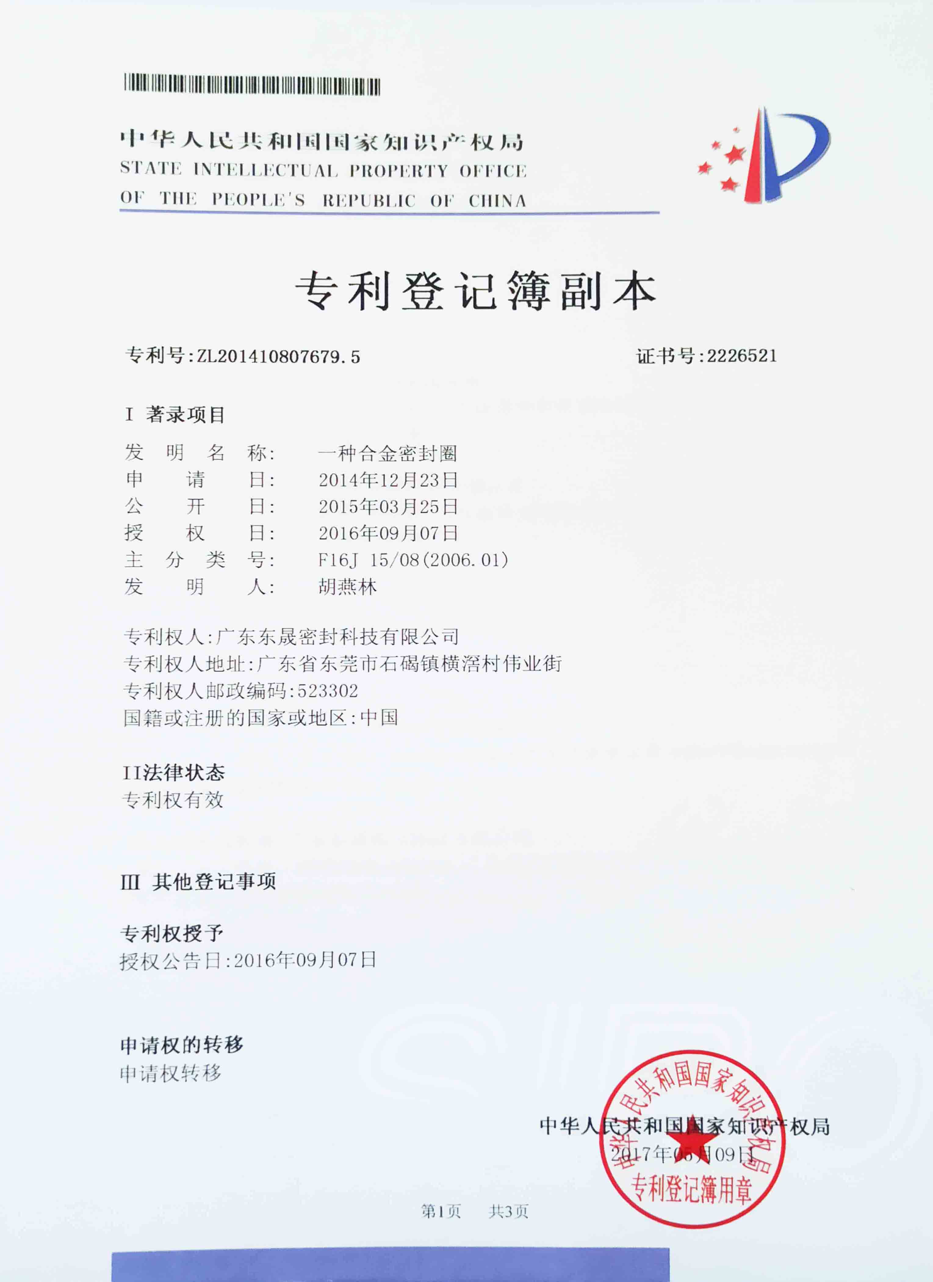 • 一種合金密封圈的專(zhuān)利證書(shū)